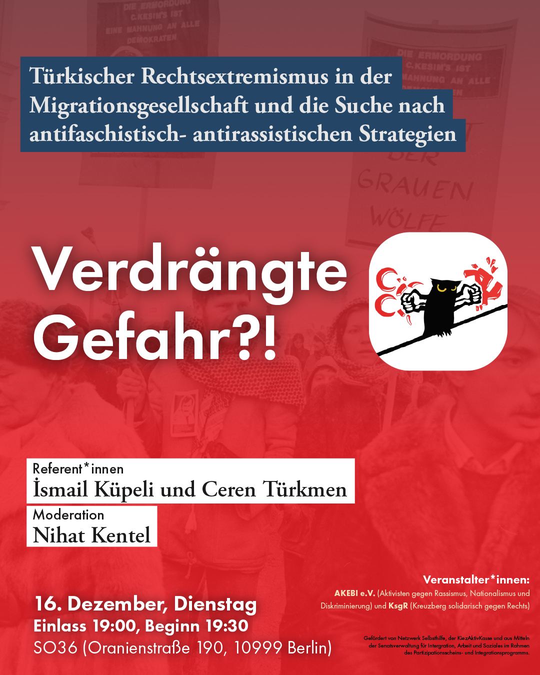 Die sogenannte „Graue-Wölfe“-Bewegung, die dem türkischen Ultranationalismus und Rechtsextremismus zugeordnet wird, ist seit Jahrzehnten auch in Deutschland aktiv. Sie gilt als eine der größten extrem rechten Bewegungen im Land. Auch in Berlin ist ihre Präsenz deutlich spürbar. Die Bewegung tritt dabei nicht nur in Form von Kultur- oder Heimatvereinen auf, sondern verfolgt eine klar politische Agenda, die sich unter anderem gegen Minderheiten wie Kurdinnen, Alevitinnen, Êzîd:innen, Armenier*innen oder queere Menschen richtet.