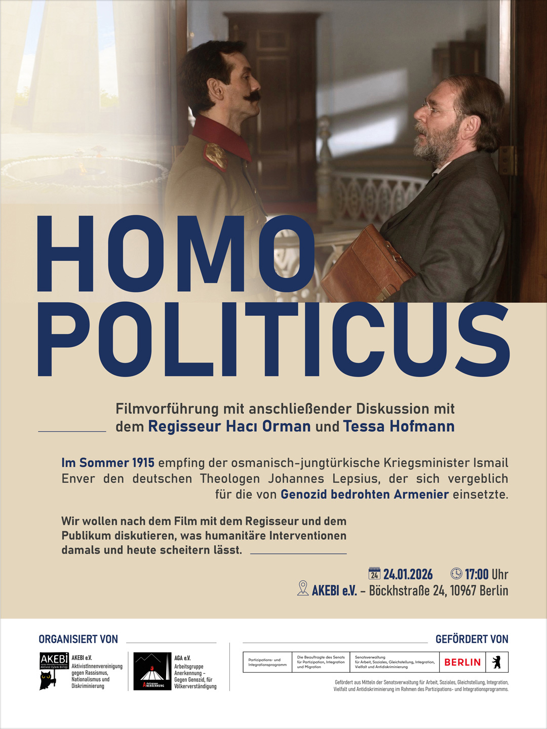 Der Film »Homo Politicus« erzählt von einem historischen Moment, der bis heute nachwirkt. Im Jahr 1915 steht Europa am Rande einer Katastrophe. Der Erste Weltkrieg wütet mit all seinen Schrecken. Doch auch im Osmanischen Reich kommt es zu einem bis dahin beispiellosen Gewaltexzess. Das Volk der Armenier soll systematisch vertrieben und ermordet werden. Daher reist der Humanist und Theologe Johannes Lepsius (Peter von Strombeck) zu einem Treffen mit dem osmanisch-jungtürkisches Kriegsminister Ismail Enver (Mehmet Yilmaz), um sich mit ihm über die Lage der Armenier im Osmanischen Reich auszutauschen. Ein Gespräch, das auch die Grenzen einer Kritik der Unmenschlichkeit aufzeigt und Franz Werfel in seinem Roman »Die vierzig Tage des Musa Dagh« ein literarisches Denkmal gesetzt hat.